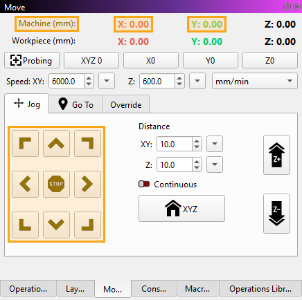 - Note the machine X and Y Axis coordinates in the Move Window, labeled Tool Position (M)
