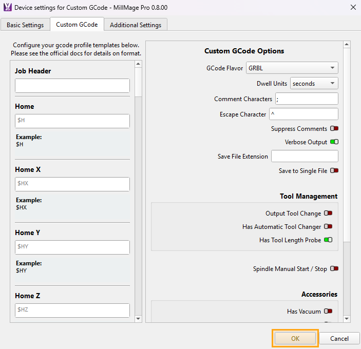 Open the Custom GCode window in the Device Settings window to define the parameters of your tool length probe by selecting either: