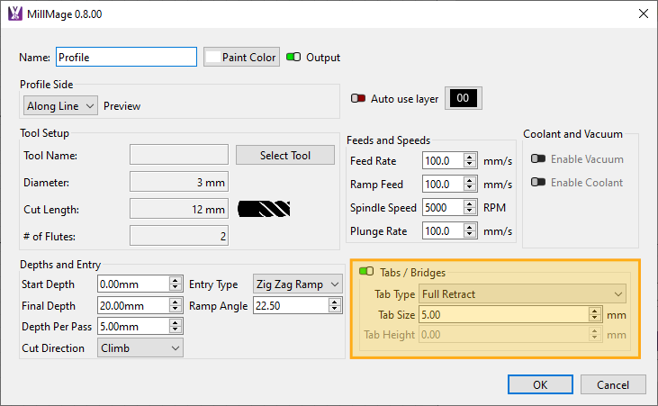 You can create tabs manually using the Add Tabs tool, or MillMage can generate them automatically using the Tab Wizard found in the Operations Window.