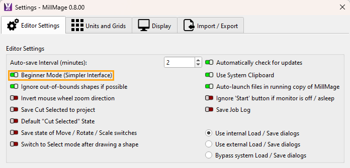 Beginner Mode simplifies the MillMage interface by removing several options that new users are unlikely to use.