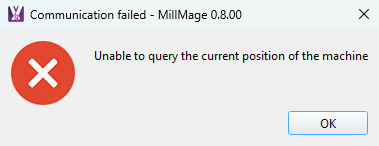 This happens when MillMage is unable to get the position of the tool center from the controller.