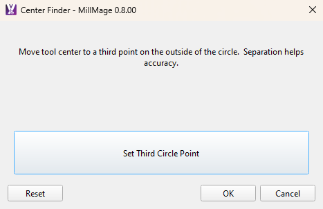 By jogging your CNC machine tool head to three positions on a circle (or other regular shape), and setting those positions in the Center Finder Wizard, MillMage can calculate the circle that passes through those three points, jog your CNC machine to its center, and create a circle in your MillMage Workspace matching those dimensions, to represent your stock.