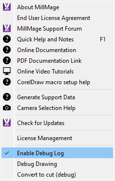 Go to Help → Enable Debug Log to begin recording a log of the actions you take in MillMage. A check mark will appear next to it when it's enabled, and logging will continue until you select Enable Debug Log again to disable it, or restart MillMage.