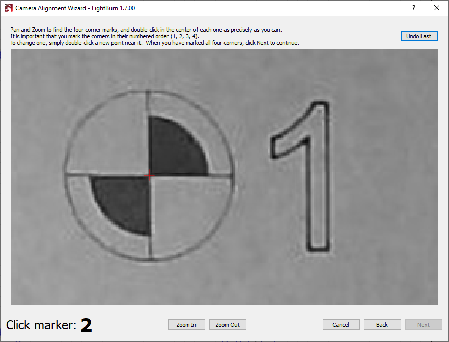 When you double-click, a red "+" mark will appear. Place a tag in the center of each of the four targets, in the order they are numbered (1, 2, 3, 4). If you place one incorrectly, you can double-click near it to shift it around, or click Undo Last to remove it and try again.