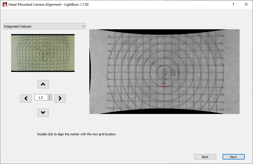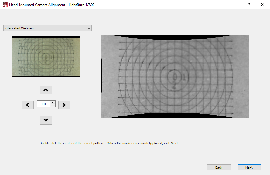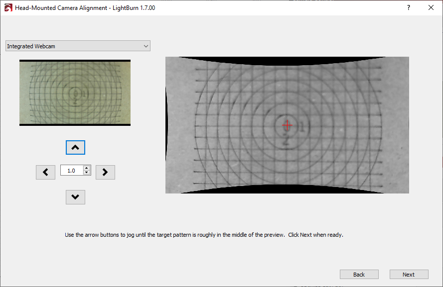 Use the Jog arrows to move the laser head, and with it the camera, until the pattern is postioned roughly in the center of the camera's field of view.