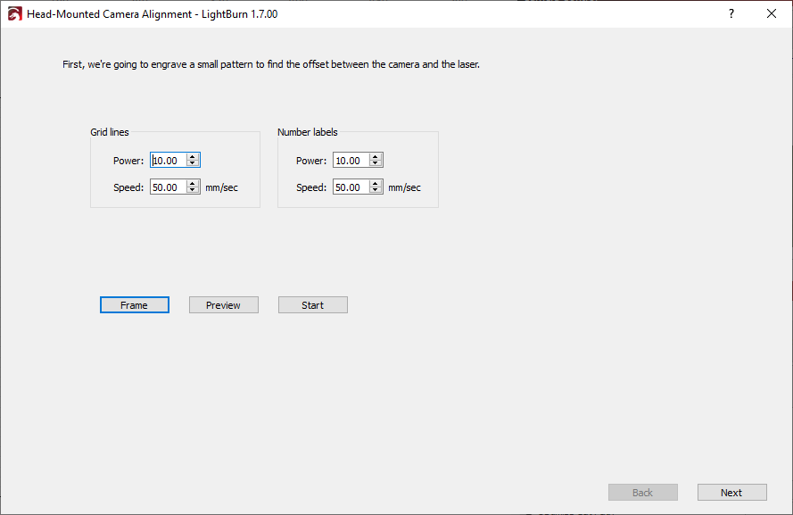 The rest of this process will be completed within the Head-Mounted Camera Alignment Wizard, which will command your laser to engrave a pattern onto a piece of material, such as card stock, paper, cardboard, or thin wood, and ask you to tag points on the pattern.