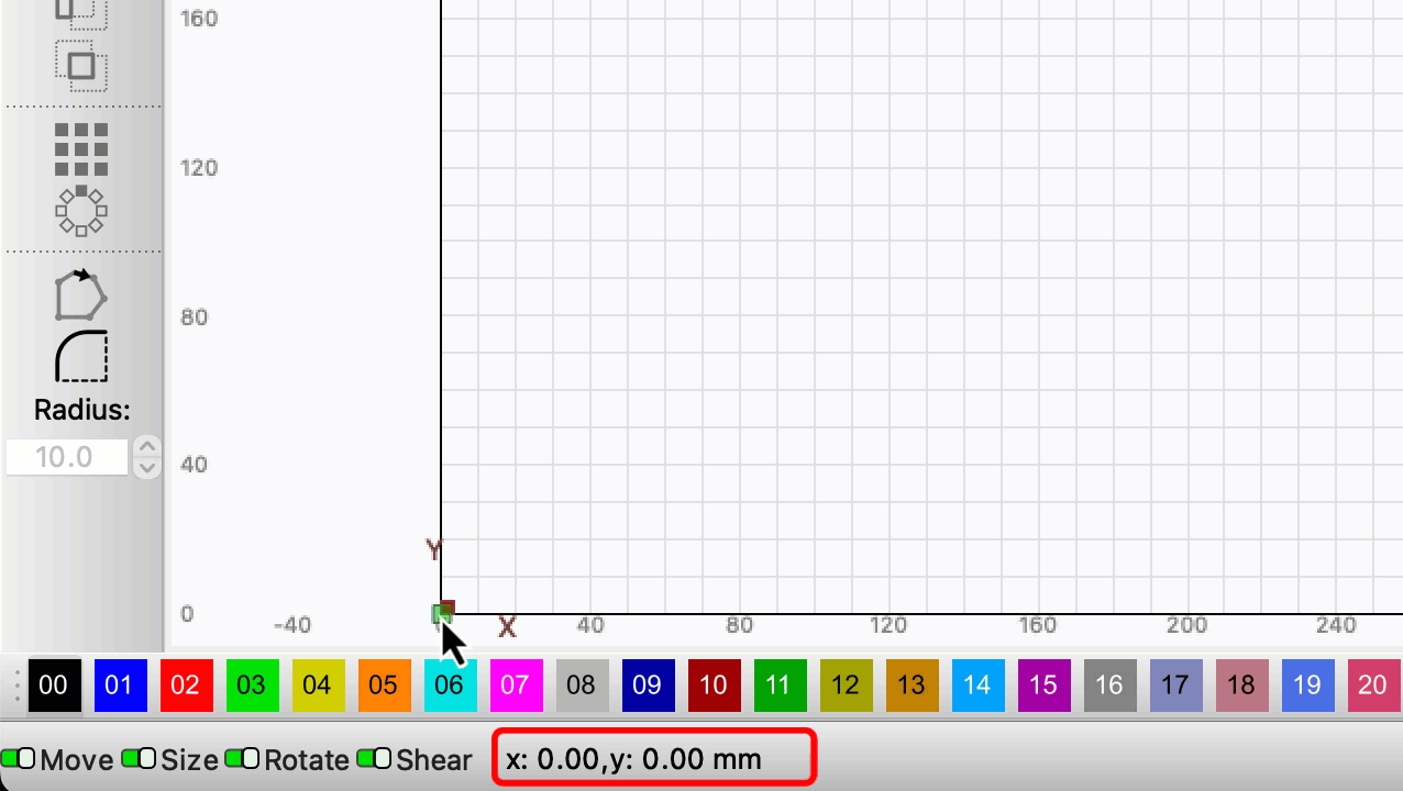 The grid in your MillMage Workspace has a coordinate system that matches the physical work area of your laser. The 0,0 position is always the location of your laser's Origin. You can see the exact location of your cursor at any given position in the Status Bar.