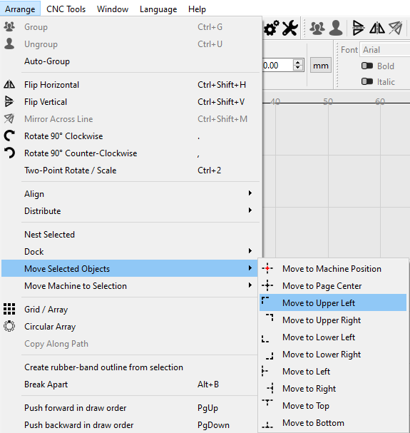 The Move Selected Objects tools move objects to a corner, midpoint, or center of your Workspace. It can also move objects to the last reported position of your machine.