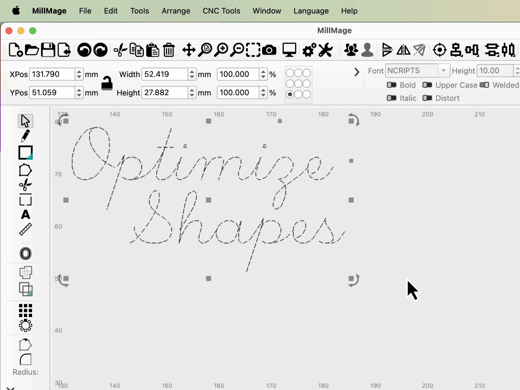 At the bottom of the window, MillMage displays the number of Points (nodes), Lines, and Curves (arcs) in the original shapes and in the optimized versions of the shapes.