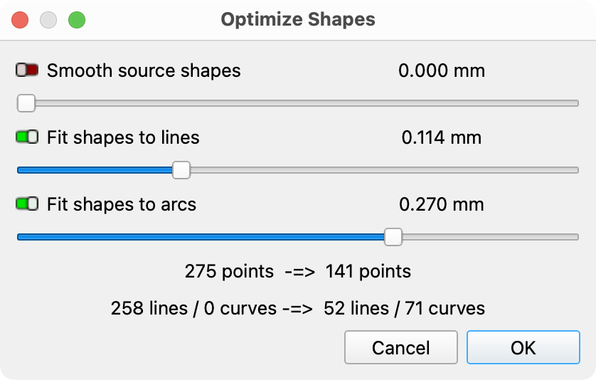 Fit shapes to arcs simplifies shapes by converting lines into arcs. This can reduce node count or recreate true arcs from software that exports them as many small line segments.