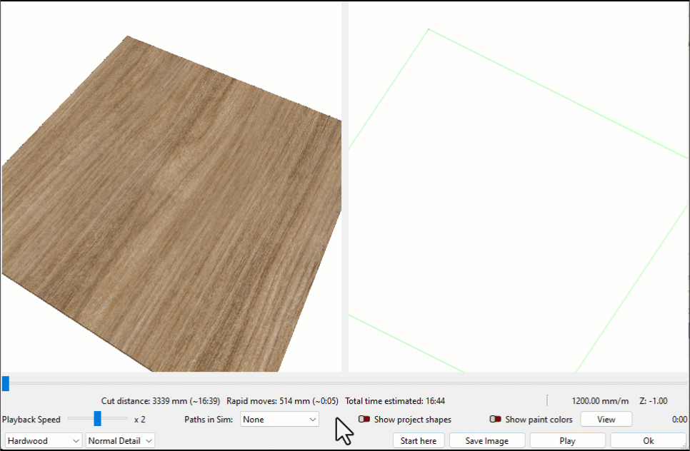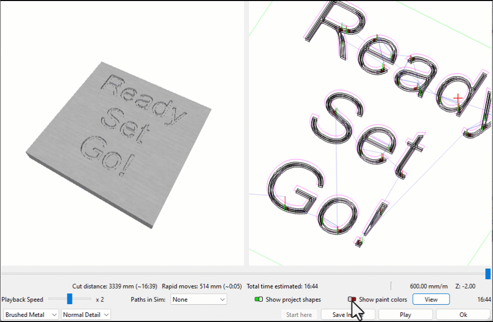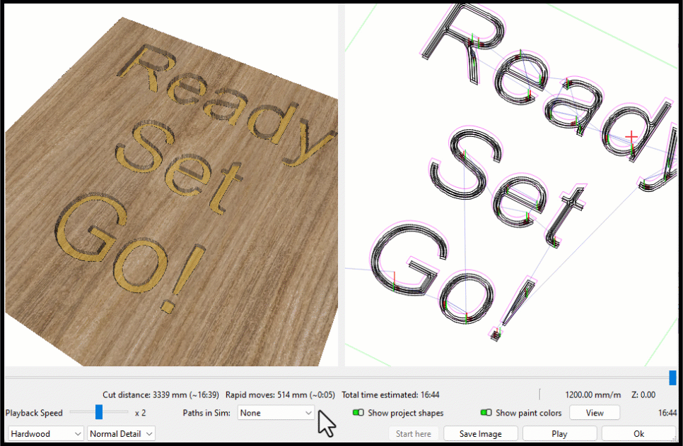 Select an option from the Paths In Sim dropdown menu to overlay the toolpath simulation onto the workpiece simulation — this will show the same paths on right side of the Preview window as the left.
