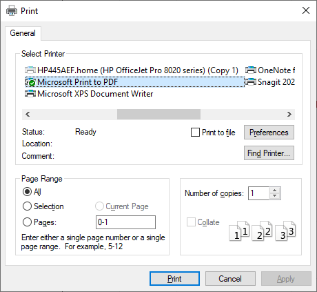 Windows 10 print dialog showing options including sending to a printer and Print to PDF