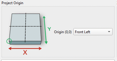 Choose the project origin — also known as the work offset — to set the (0,0) point for the X- and Y-axis on the material workstock in relation to the first imported or drawn artwork. The project origin corresponds to the physical X- and Y-axis point you will home the tip of the router tooling against.