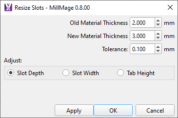 Tolerance specifies an added amount of padding to Old Material Thickness — slots or tabs that are within the range of Old Material Thickness plus or minus Tolerance will be identified by the resizer.