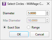 Selects all circles of a specific size or within a size range. Select Exact Size and specify a size, or select Range and choose a minimum and maximum size.