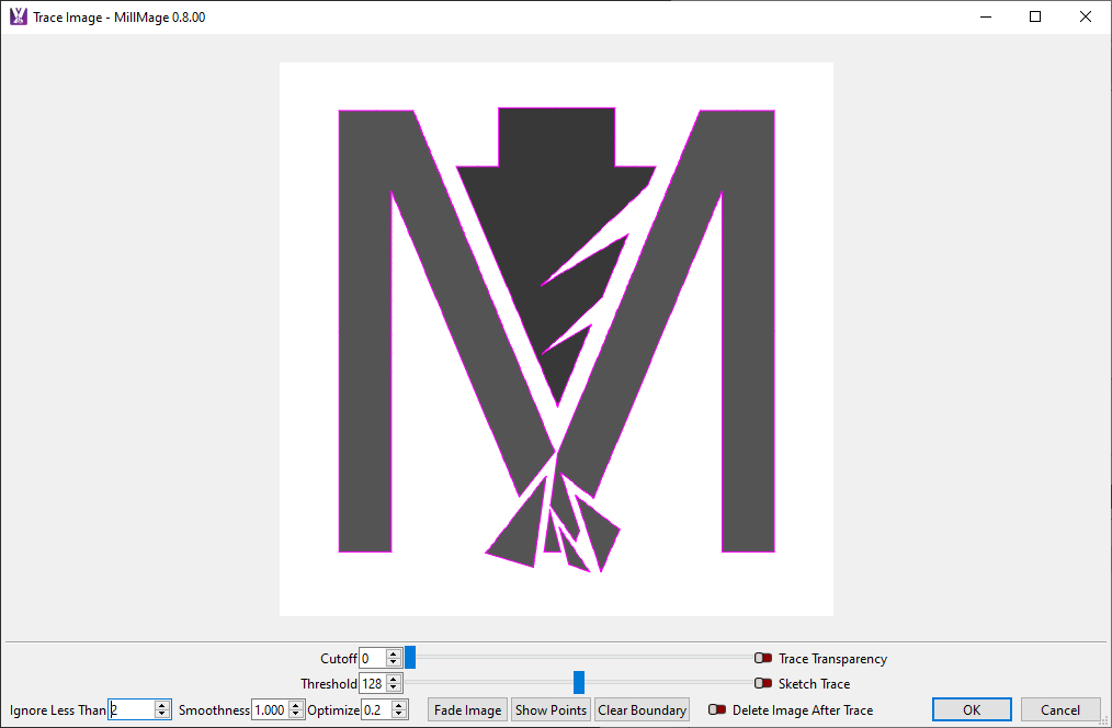 Tracing works by automatically creating an approximation of the pixel-based image in vector format, and while MillMage's trace function is extremely robust, it remains limited by both the computationally-difficult nature of this task, and the quality of the image it is presented with. In some instances fine details — for example sharp corners and small text — may not be converted well during this process.