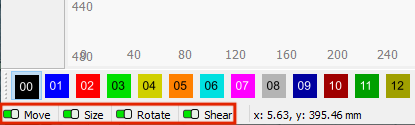 Use the Transform Control Toggles in the bottom left of the MillMage window to enable and disable specific types of editing across an entire project, and prevent accidental edits, such as inadvertently scaling a design that contains strict sizing, or moving tightly nested parts.