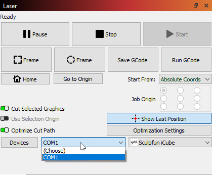 Depending on the type of device you have and the connection method you're using, you may have a dropdown in the Job Control window to choose the serial port. The screenshot below highlights its location between Devices and the name of the active device.